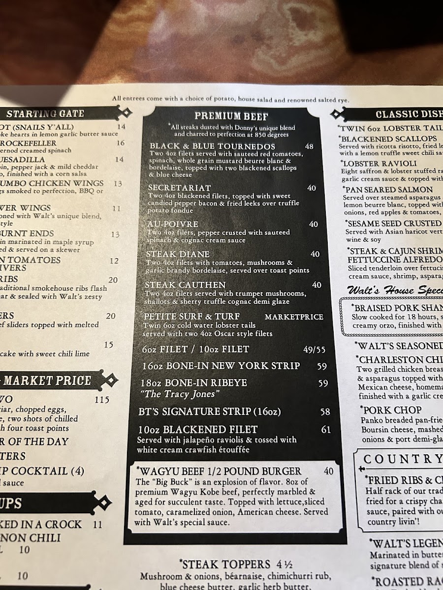 When it comes to the main attraction, the steaks are truly where Walt’s shines. The Bt's Signature Strip (16 oz) will tantalize your taste buds with its tender texture and rich flavor, while the 6 oz Filet offers a perfectly portioned experience without skimping on quality. Diners rave about the generous portions and the flavors that dance on your palate, praising dishes like the bone-in ribeye accented with Bleu cheese and blackened scallops, as shared by a delighted patron celebrating their anniversary.